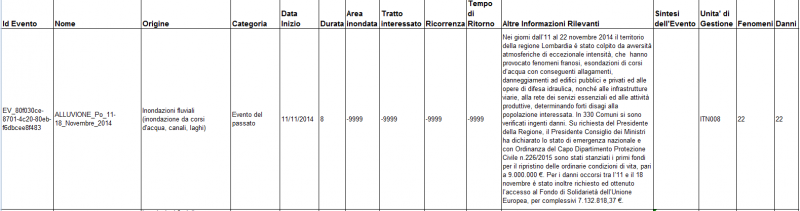 si scarica in automatico un file in formato Excel contenente due schede, Fenomeni e Danni. La scheda Excel nominata Fenomeno contiene le informazioni relative al codice e ID evento, ID Fenomeno, Nome del Fenomeno, Descrizione, Caratteristiche della Piena, Meccanismo della Piena e Numero di Danni, come mostrato nell’esempio della Figura successiva.
